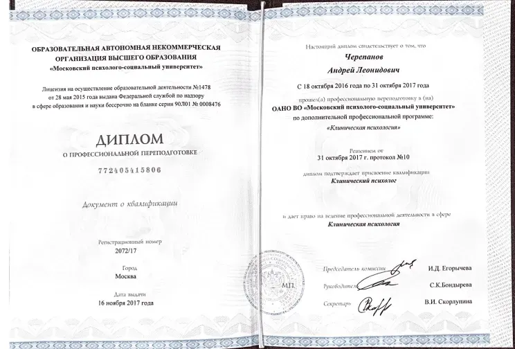 Московский институт психоанализа. Курс: « Социально-психологическая реабилитация пациентов с зависимыми формами поведения: комплексный подход». Получение диплома.